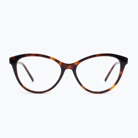 Mẫu gọng sở hữu dáng bầu dục mềm mại, các đường cong được trau chuốt tinh tế, tạo cảm giác nhẹ nhàng và thanh thoát ngay từ ánh nhìn đầu tiên. Phần đuôi kính khẽ xếch theo phom mắt mèo cổ điển, giúp gương mặt trông cao ráo hơn, tươi trẻ và đầy cuốn hút. Điểm nhấn là hai đinh tán kim loại nhỏ ở góc kính - chi tiết vừa mang tính thẩm mỹ, vừa tăng độ chắc chắn cho tổng thể thiết kế.