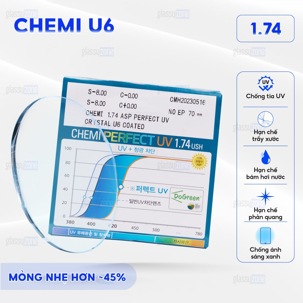 - Chemi U6 1.74 là tròng kính mỏng nhất có sẵn trên thị trường, giúp giảm mỏng và nhẹ hơn 50% so với tròng kính thông thường chiết suất. Phù hợp với người bị cận/loạn nặng và mong muốn có cặp kính mỏng, nhẹ hơn. Đặc biệt là với những người có độ khúc xạ cao.